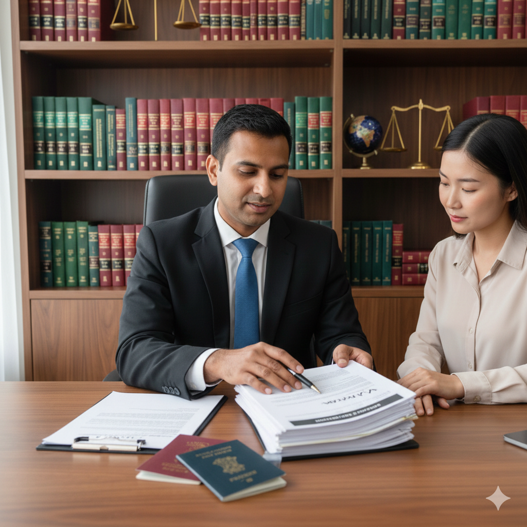An immigration lawyer assists with student visas, work permits, business visas, visa refusals, deportation matters, OCI documentation, passport issues, and legal representation before authorities.